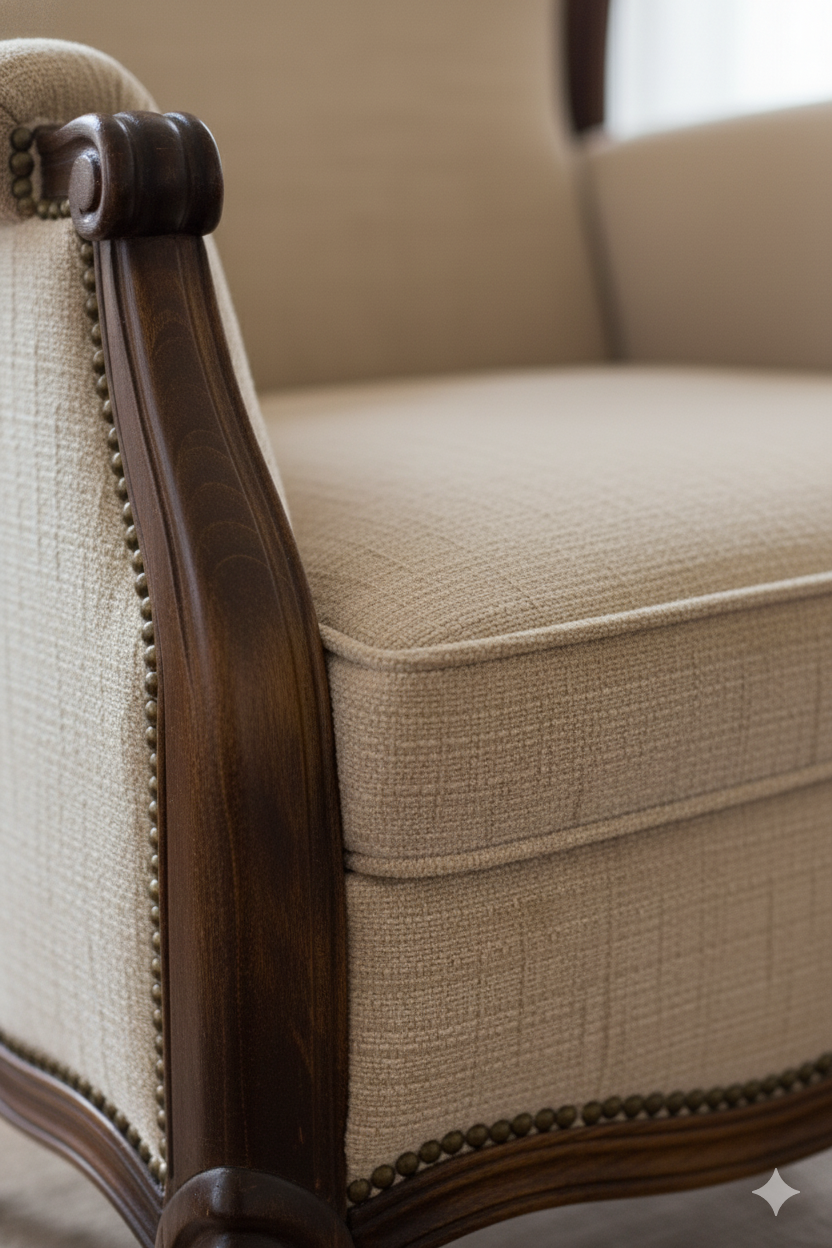 Capture the elegance of 18th-century France with this refined armchair. The chair features a dramatic, exposed solid wood frame with a deep walnut or espresso finish that beautifully contrasts with the light, luxurious upholstery. This piece is a statement of classic, enduring style.