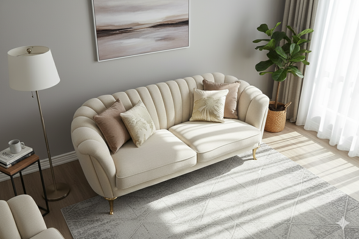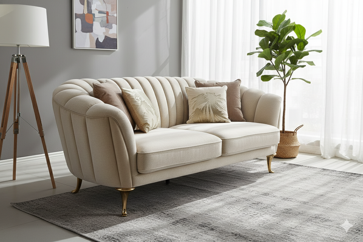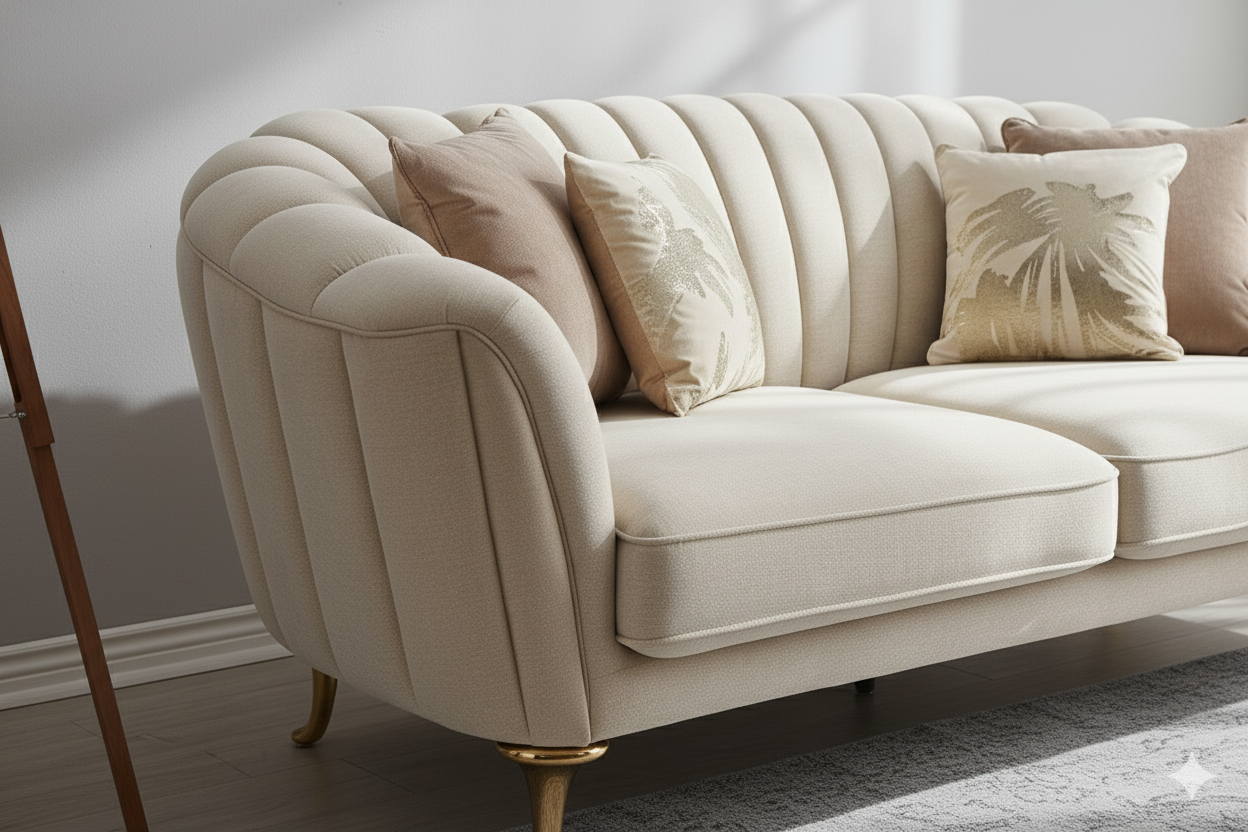 Luxurious Channel-Tufted Cream Loveseat with Gold Accents