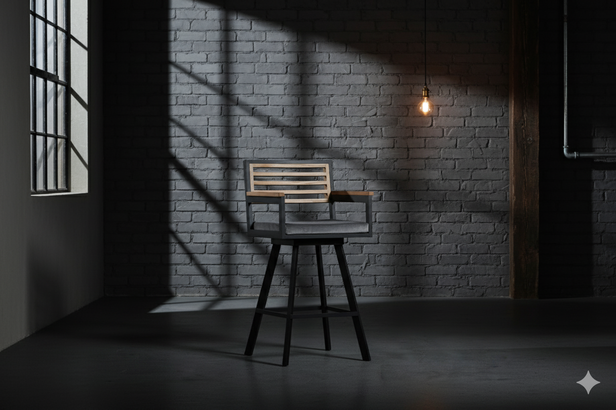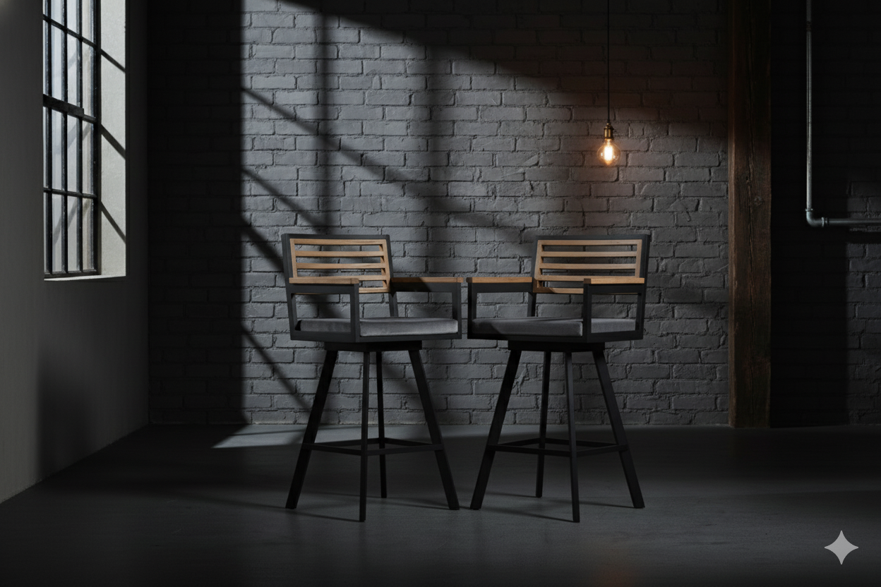 This bar stool masterfully blends rugged industrial style with natural warmth, creating a statement piece for your kitchen or home bar. The frame is a sturdy, matte black metal with bold, angular lines. The design is softened by the inclusion of a slatted light-toned wood backrest and matching wood accents on the armrests.
