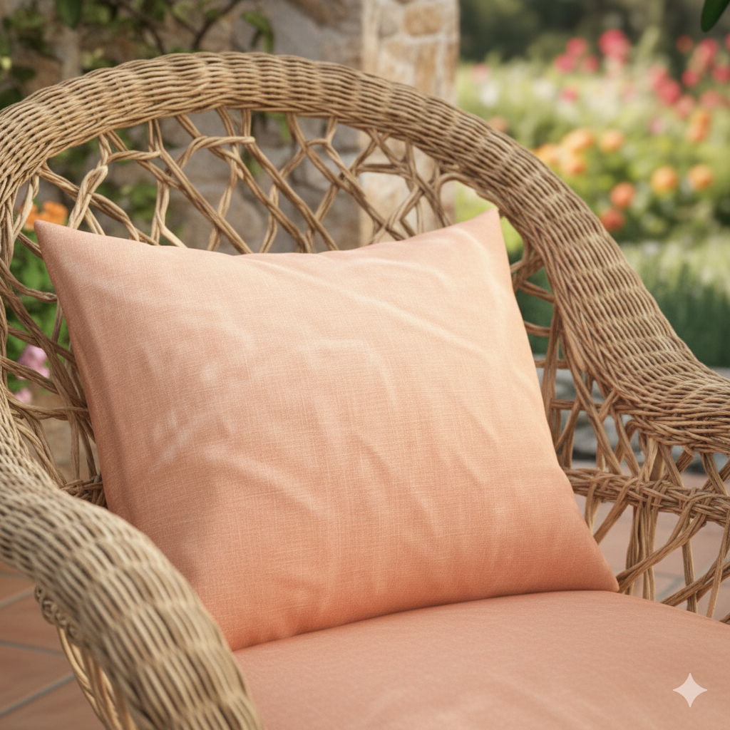 Plush Comfort: The chair is designed with a high, rounded back and comes with a thick, salmon/peach-colored seat cushion and back pillow.